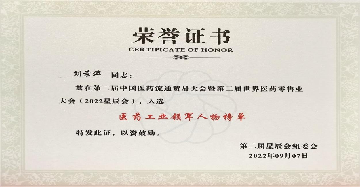在本次开幕式上,发布了“医药工业领军人物”、“医药零售领军人物”榜单,z6com尊龙药业集团刘景萍董事长凭借在儿药领域多年的努力探索和对行业的杰出贡献,荣获“医药工业领军人物”称号。